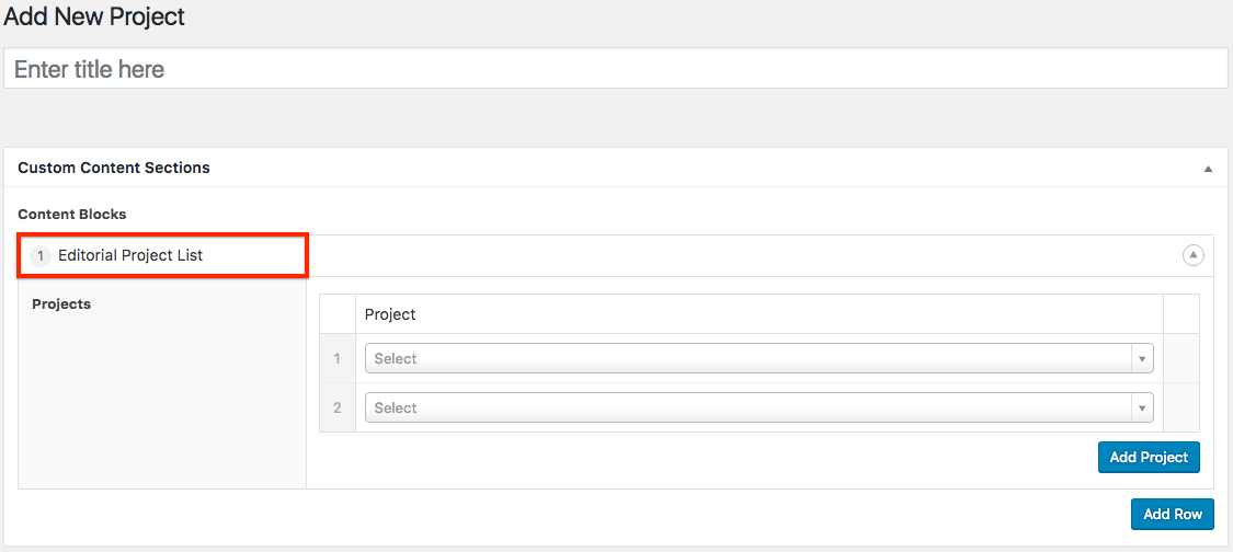 This component is typically used on the Projects Listing page. An infinite number of projects may be added by selecting and searching project detail pages within the component.