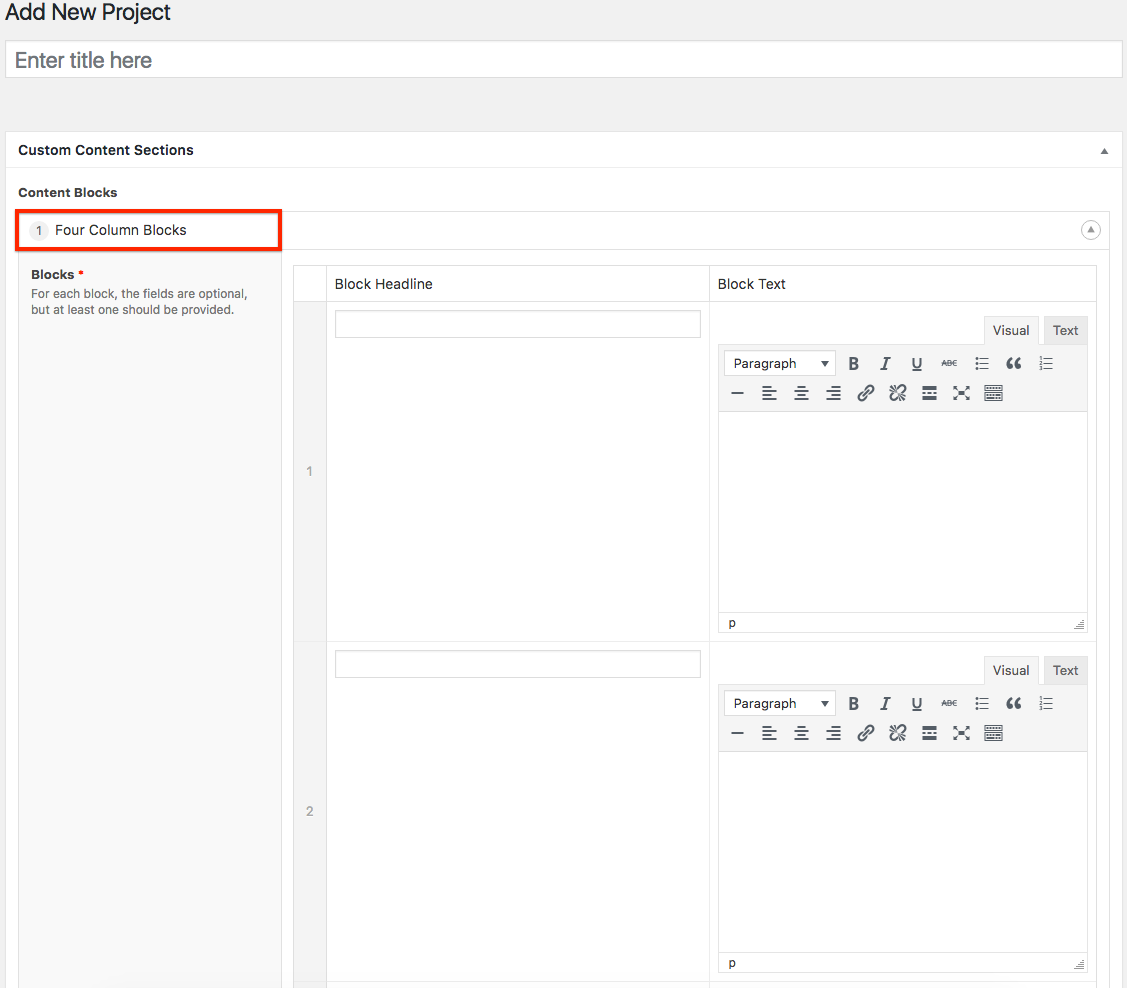 Four Column Blocks are used to create 1 row of 4 blocks, each with a block headline and block text below. At the time this guide was created this type of custom content section was not in use on watg.com.
