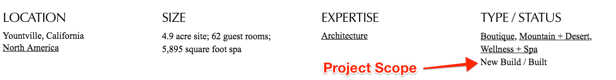 This component should be placed immediately after the full-width hero image to describe a project's details and statistics. It will appear as four columns of information. Regions, Expertise and Types also appear in the Project Data component. Please reference the screenshot below as an example (text formatting subject to change).