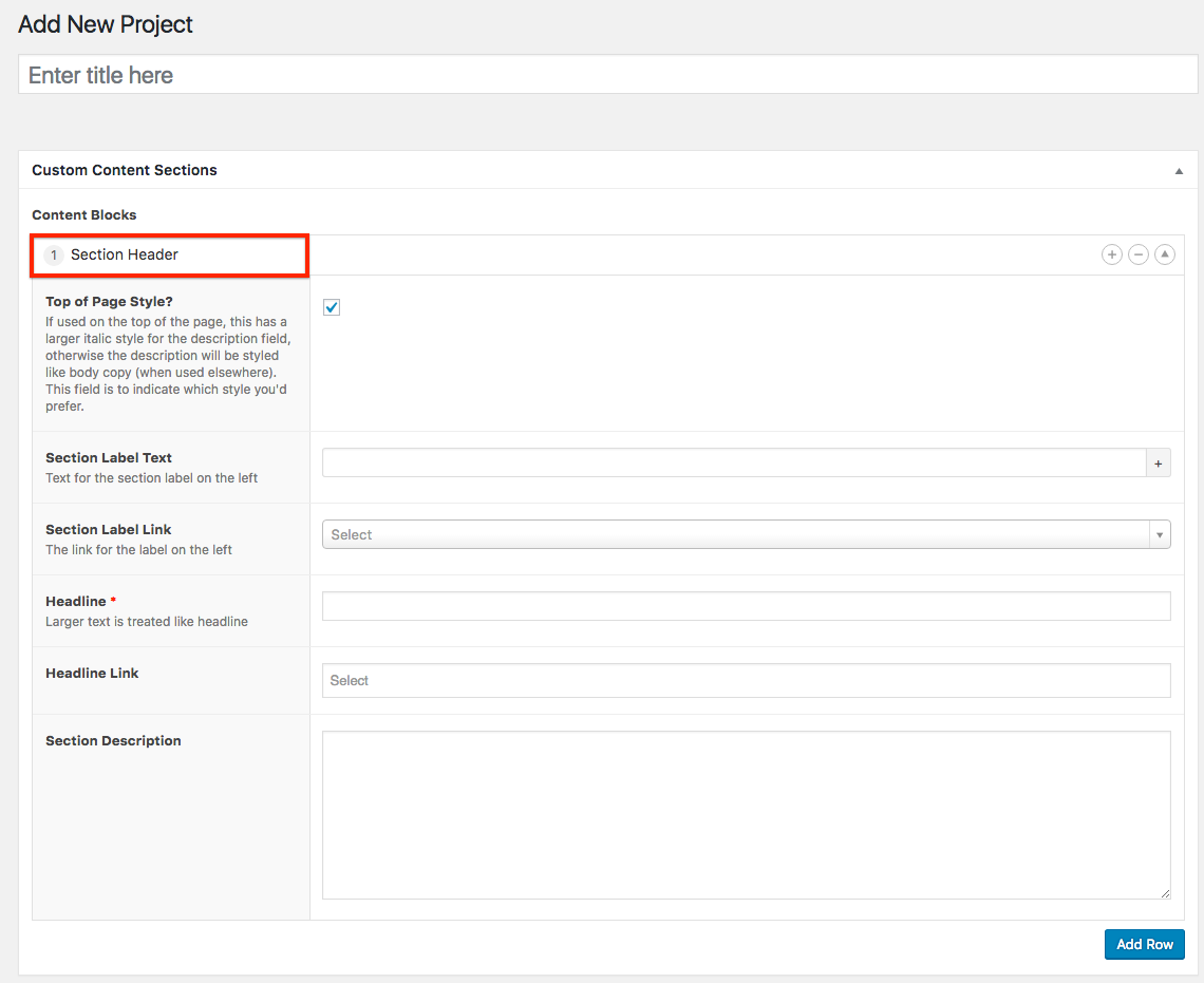 In the section header component the author can add section label text and a section label link. This should link back to the parent listing page. At the top of the page it is required to add a headline. In the case of a project this will be the name of the project. There is an option for the author to add a headline link, which is not recommended for use. The section description acts as a sub-headline with a short description of the page itself.