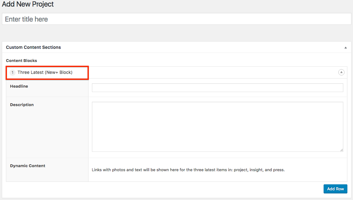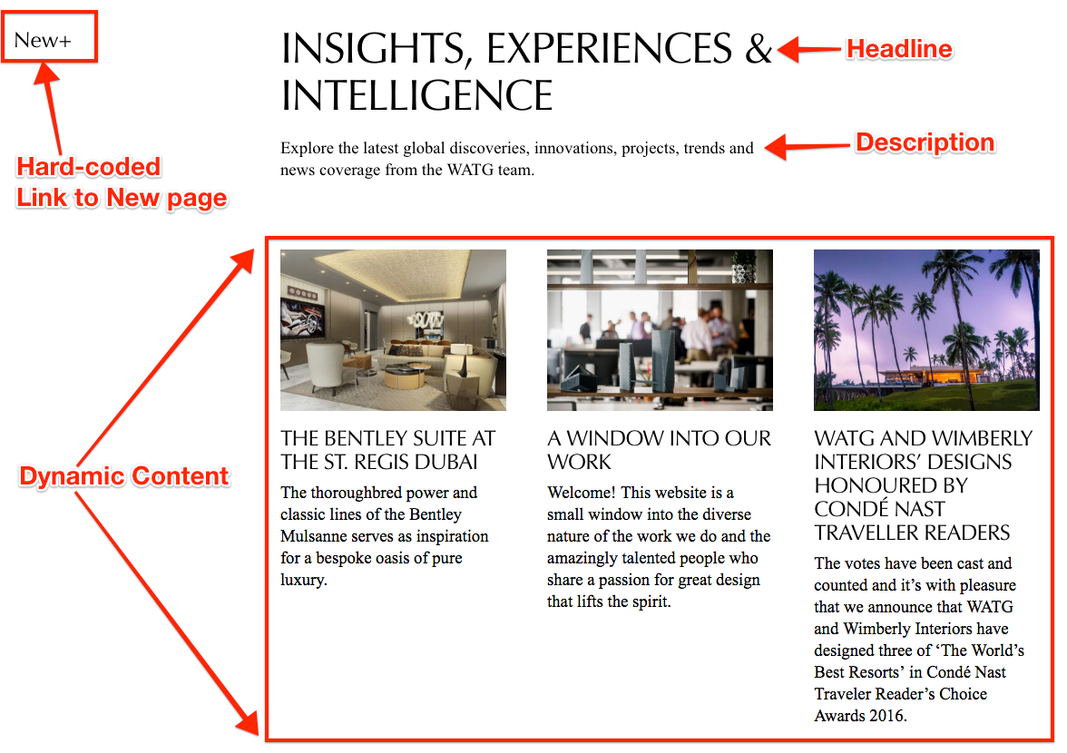 This component will display dynamic content with a headline and sub-headline. The New+ link is hard-coded into the component, as seen in the screenshot of the WATG homepage below.