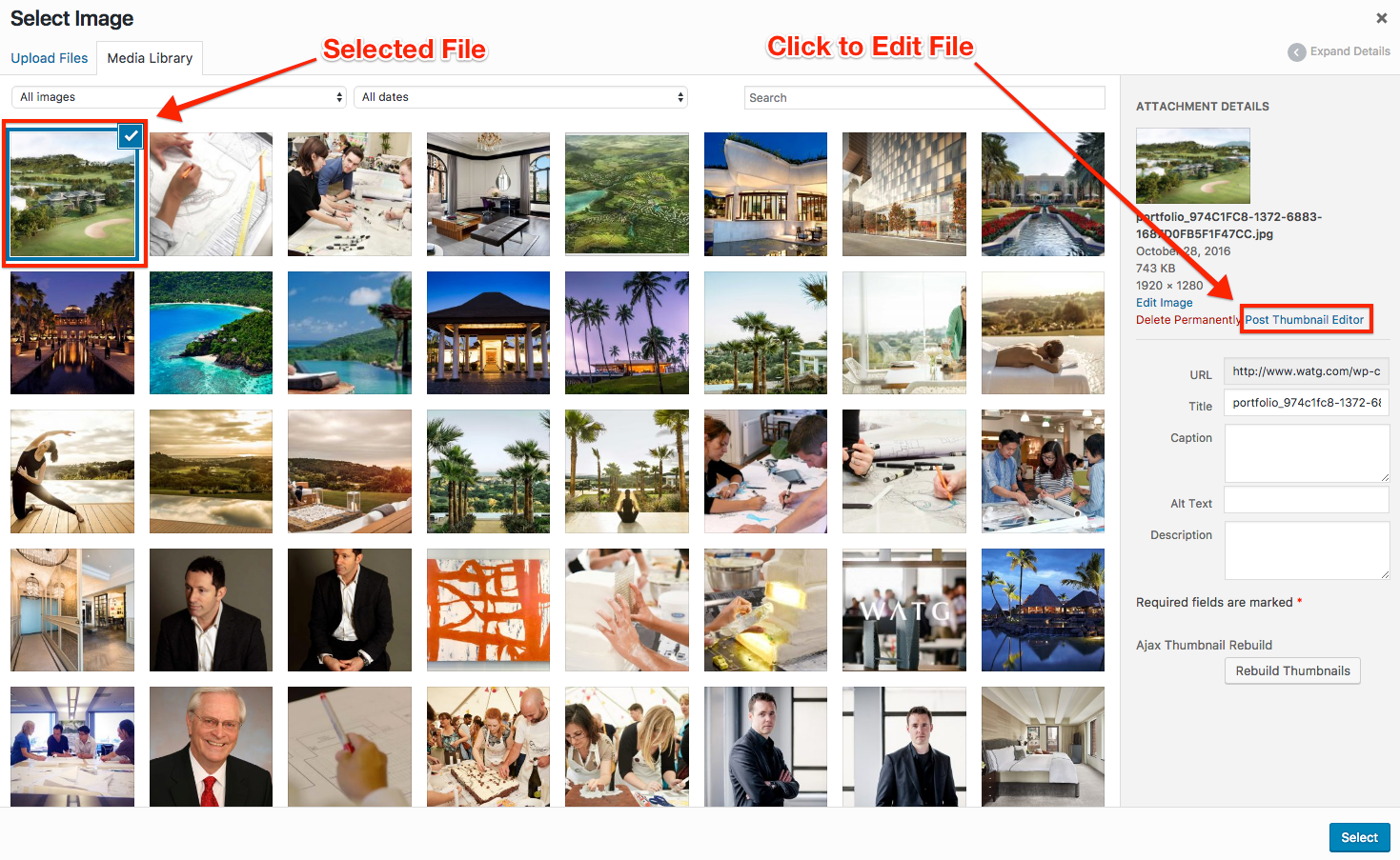 A file can be added to the Media Library for direct use in a component by clicking the Add Image button. Doing so will open the Media Library. Different sized thumbnails are generated for image files in the Media Library and can now be shared for use in different custom components.