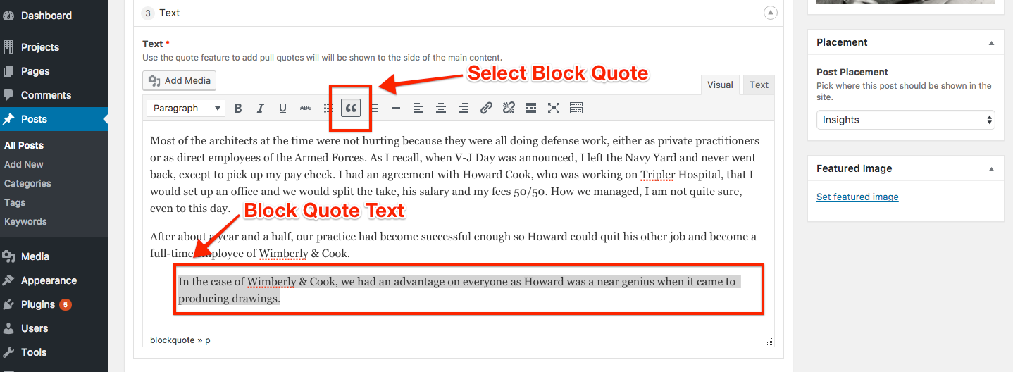 Once published, Blockquotes will appear off to the left of the text in a Text Block, even though they are both entered in the same component.