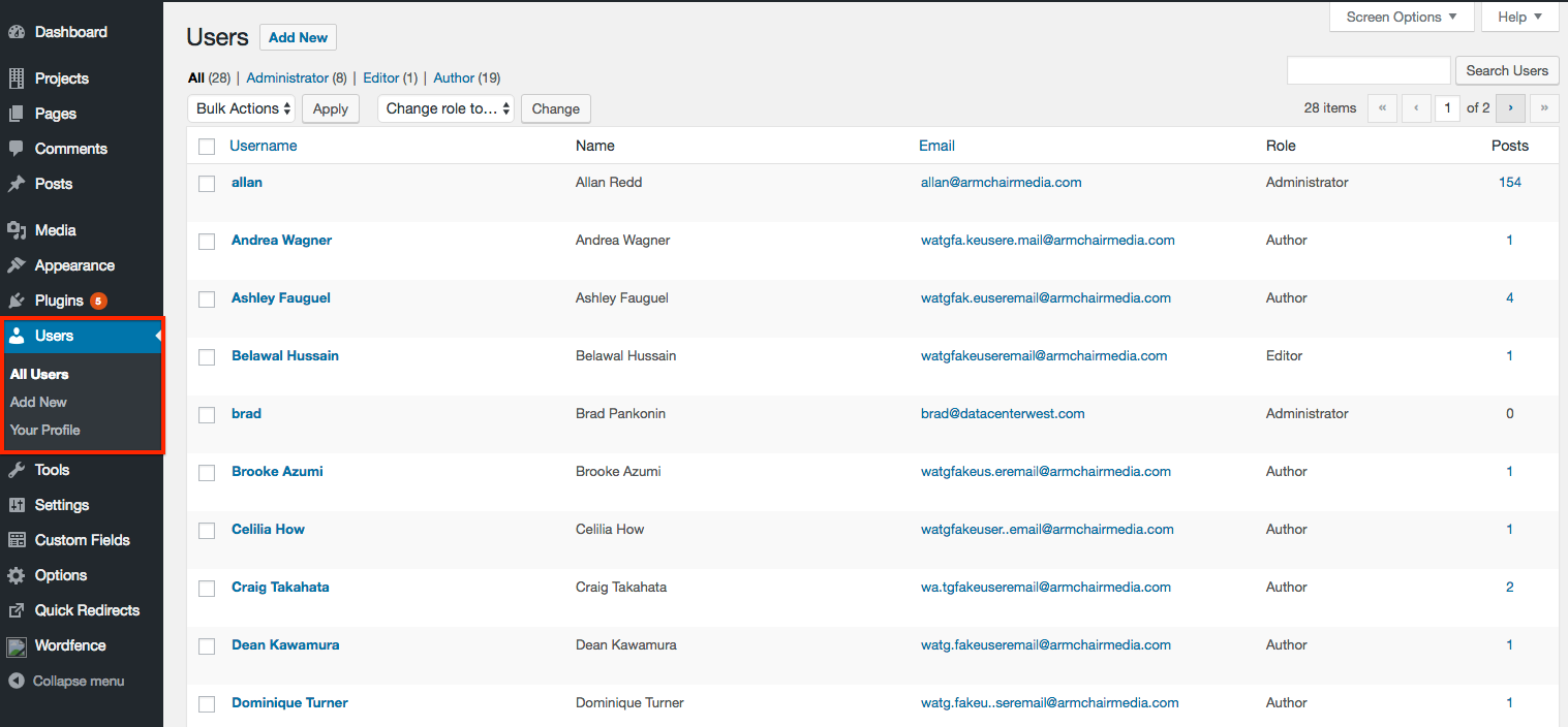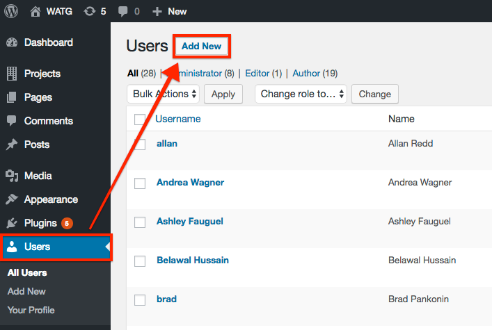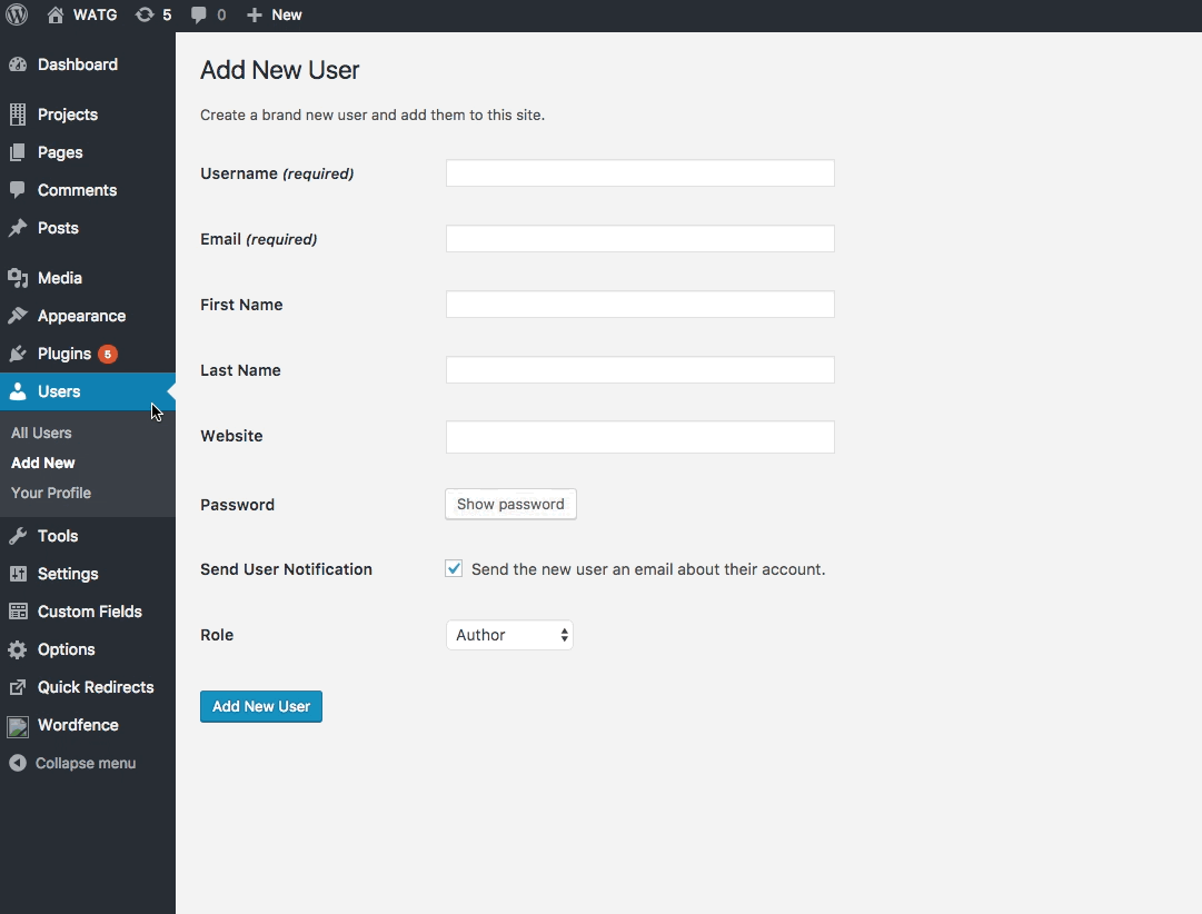 Step 1: In the Users section, click Add New, then fill out their info. The system will autogenerate a password. For Authors, you can use a fake email address like "watguser72@watg.com" "watguser73@watg.com" and so on – this will be ignored for our purposes. Authors attributed to Posts should have a profile image included.