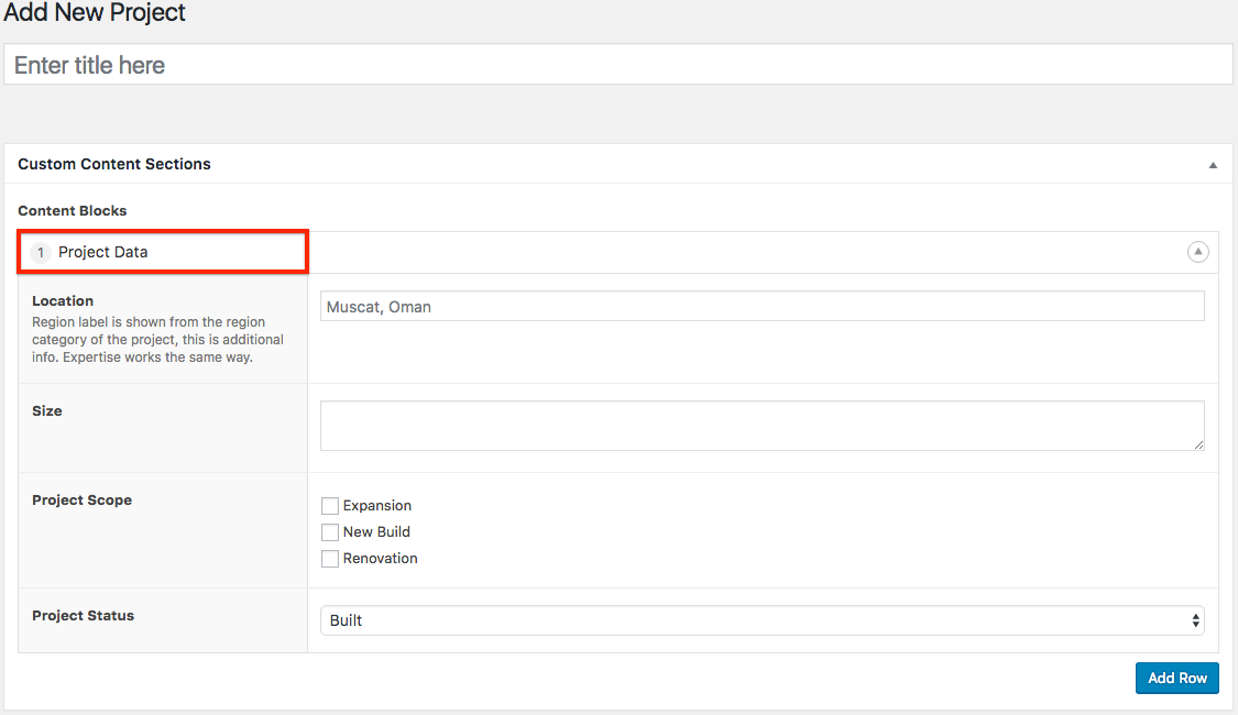 This component should be placed immediately after the full-width hero image to describe a project's details and statistics. It will appear as four columns of information. Regions, Expertise and Types also appear in the Project Data component. Please reference the screenshot below as an example (text formatting subject to change).