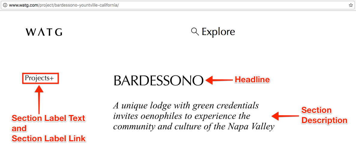 In the section header component the author can add section label text and a section label link. This should link back to the parent listing page. At the top of the page it is required to add a headline. In the case of a project this will be the name of the project. There is an option for the author to add a headline link, which is not recommended for use. The section description acts as a sub-headline with a short description of the page itself.