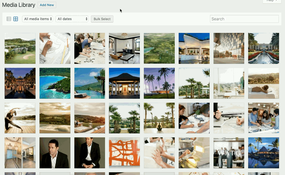 A file can be added to the Media Library for direct use in a component by clicking the Add Image button. Doing so will open the Media Library. Different sized thumbnails are generated for image files in the Media Library and can now be shared for use in different custom components.