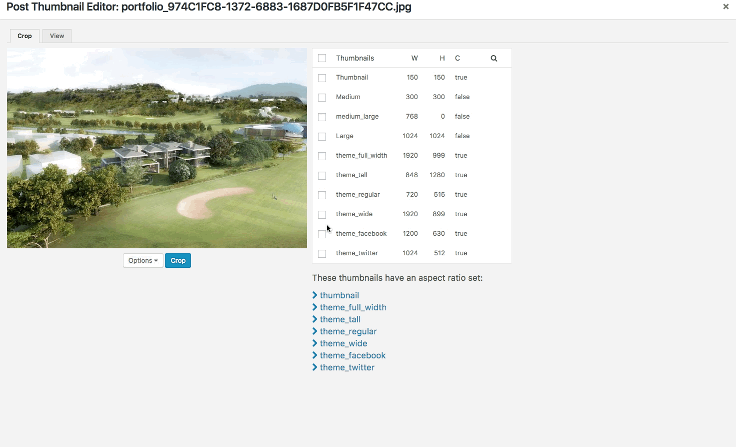 Once uploaded an image can be cropped using the Post Thumbnail Editor.