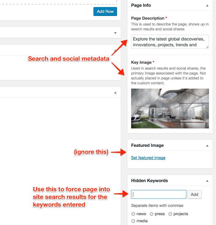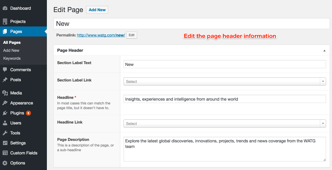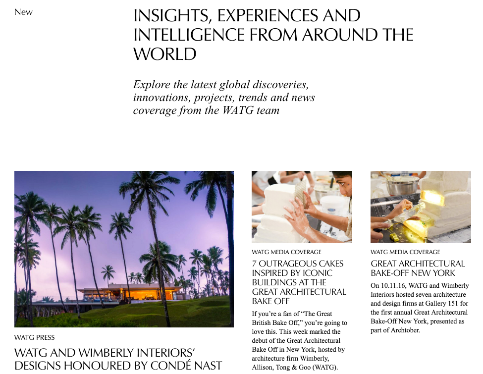 For example, New displays links to the latest projects, press and insight pages are sorted by date. You don’t have to edit this list. As new posts are added, they will show up here, ordered by publishing date (which can be changed, if you ever need to prioritize the standing of content – back-dating older projects is recommended so they don't appear as "new").