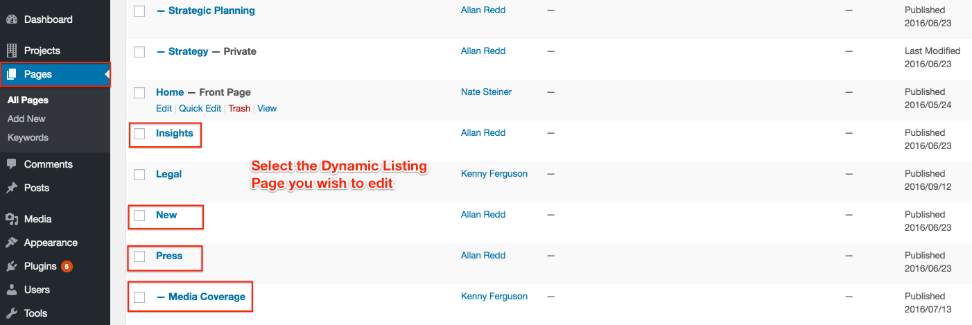 The main pages for New, Insights, Press, and Media Coverage sections are dynamic listing pages. These include time saving features that will auto-populate as deeper level pages are updated.