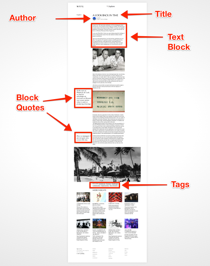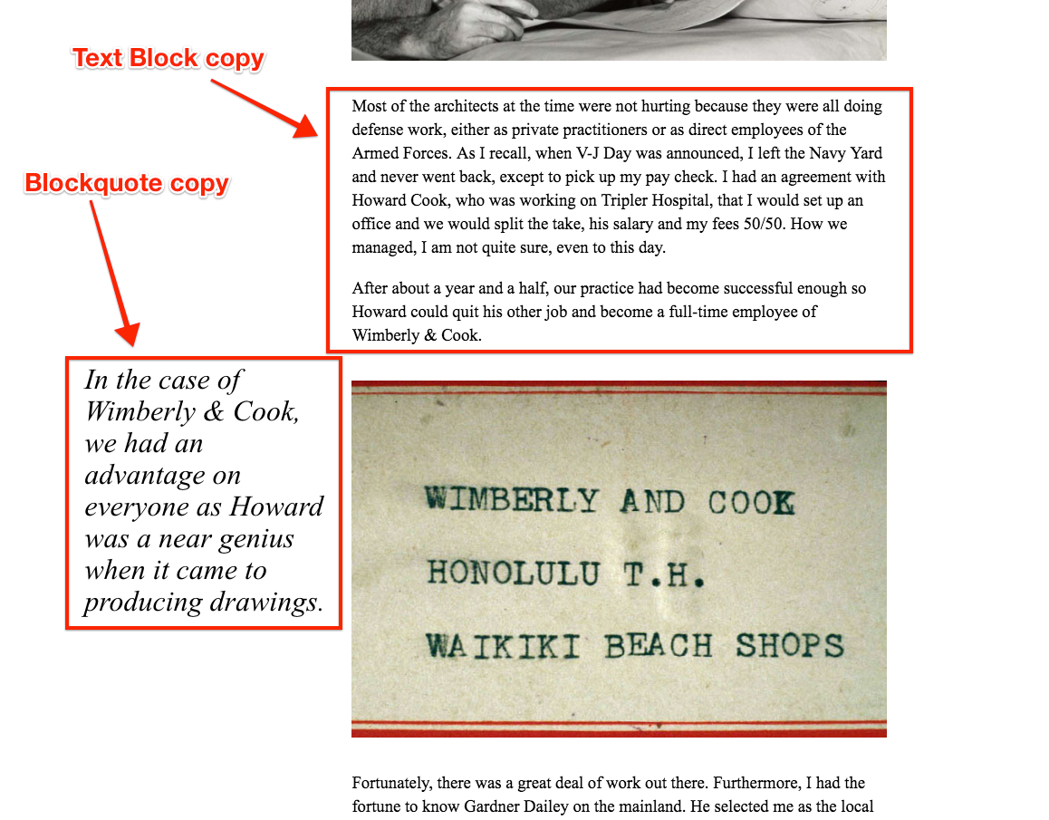 Copy can be singled out to appear as a pulled Blockquote. Highlight the section of text that will become a Blockquote, Click the Blockquote button in the rich text editor.