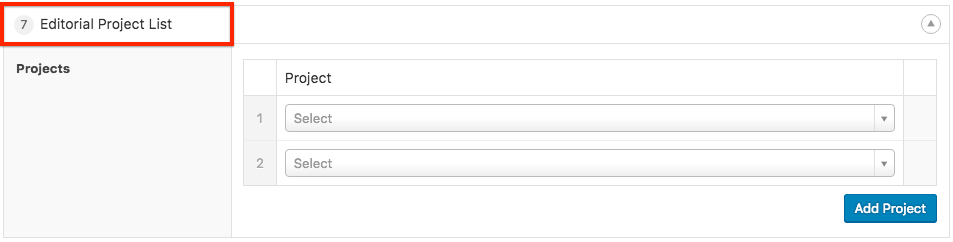Step 2. Add the Editorial Project List component. An infinite number of projects can be added. Note that these pages are editorially ordered, so when a new project is added, it must be manually added to a project listing page to appear.